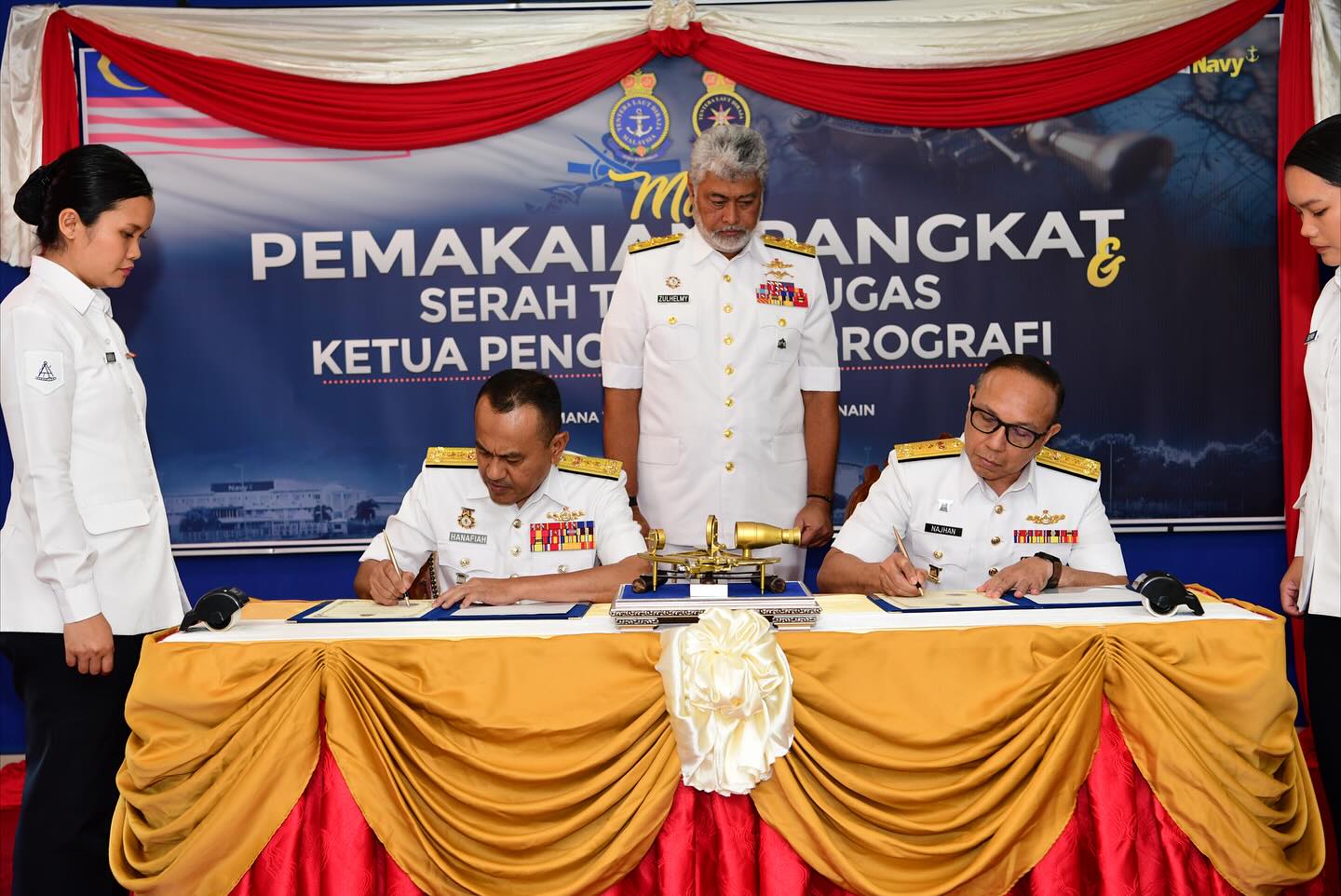 PULAU INDAH, 27 Okt 2025- MAJLIS PEMAKAIAN PANGKAT DAN SERAH TERIMA TUGAS KETUA PENGARAH HIDROGRAFI KE-8 telah berlangsung dengan penuh istiadat di Wisma Laskar, Pusat Hidrografi Nasional.Majlis disempurnakan oleh Panglima Tentera Laut, Laksamana Tan Sri (Dr.) Zulhelmy bin Ithnain, yang turut dihadiri oleh Ahli Jawatankuasa Laksamana (JLAKS) dan warga Pusat Hidrografi Nasional serta unit bawah naungan. Majlis dimulakan dengan Pemakaian Pangkat Timbalan Ketua Pengarah Hidrografi, yang telah dinaikkan pangkat ke Laksamana Muda berkuat kuasa pada 26 Oktober 2025. Majlis diteruskan dengan upacara menandatangani Sijil Serah Terima Tugas di antara Laksamana Muda Dato’ Hanafiah bin Hassan dan Laksamana Muda Dr. Najhan bin Md Said, diikuti dengan penyerahan Nota Serah Terima Tugas serta upacara menaik dan menurunkan Insignia Pemerintah. Majlis turut diserikan dengan upacara penyerahan simbolik pemerintahan serta laungan ‘Start Of Line’ yang menandakan penyerahan rasmi tampuk kepimpinan kepada Ketua Pengarah Hidrografi yang baharu.Di penghujung majlis, seluruh warga Pusat Hidrografi Nasional dan unit naungan berbaris dalam formasi ‘Street Lining’ sebagai tanda penghormatan terakhir kepada mantan Ketua Pengarah Hidrografi ke-7 yang berjalan melalui barisan warga sambil menerima lambaian dan salam perpisahan penuh hormat. Sekalung tahniah diucapkan kepada Laksamana Muda Dr. Najhan bin Md Said atas pelantikan sebagai Ketua Pengarah Hidrografi Ke-8, serta setinggi-tinggi penghargaan dan terima kasih kepada Laksamana Muda Dato’ Hanafiah bin Hassan atas kepimpinan, jasa dan sumbangan cemerlang sepanjang menerajui Pusat Hidrografi Nasional.