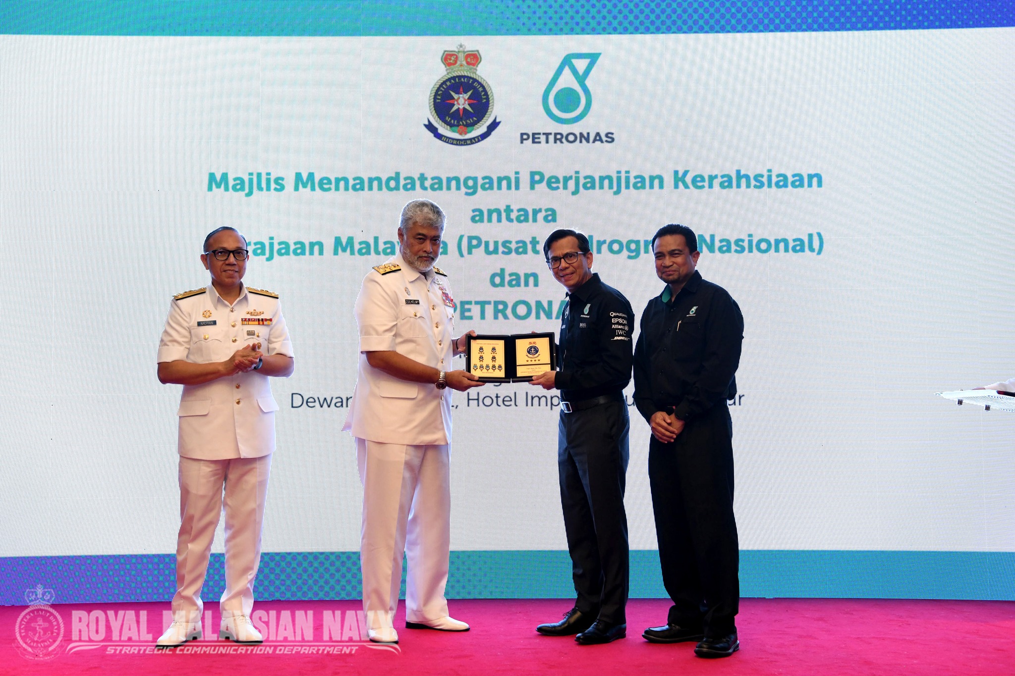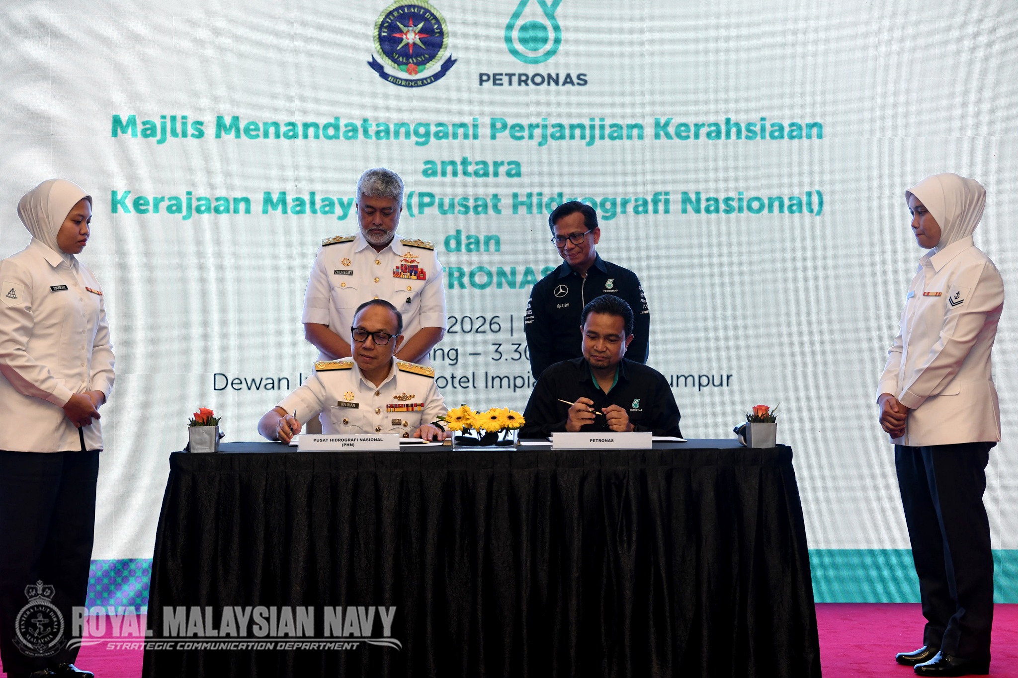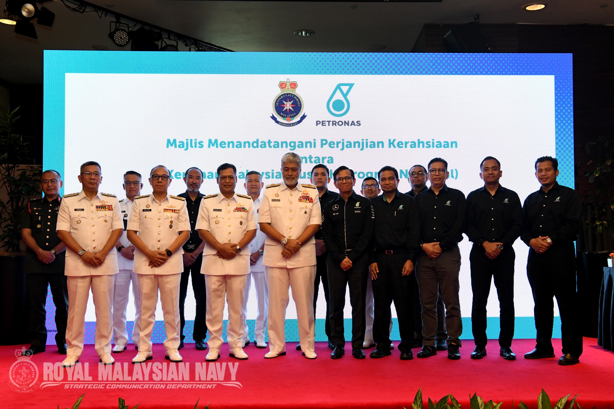 KUALA LUMPUR, 5 MAC 2026- MAJLIS MENANDATANGANI NDA TLDM-PETRONAS. Pemeteraian Non-Disclosure Agreement (NDA) antara TLDM dan PETRONAS hari ini bukan sekadar formaliti, tetapi simbol komitmen strategik dalam memperkukuh keselamatan dan tadbir urus perkongsian data geospatial marin demi kepentingan negara. Kerjasama yang terjalin sejak 2013 ini menyokong integrasi data melalui GIS dan pembangunan MSDI, sekali gus meningkatkan Maritime Domain Awareness, perlindungan infrastruktur luar pesisir serta keupayaan membuat keputusan berasaskan data. Inisiatif ini turut menyokong peralihan global ke arah piawaian S-100 oleh International Hydrographic Organization, meletakkan Malaysia seiring perkembangan hidrografi antarabangsa. Majlis ini disaksikan oleh Panglima Tentera Laut, Laksamana Tan Sri (Dr.) Zulhelmy bin Ithnain, Timbalan Panglima Tentera Laut, Laksamana Madya Datuk Badarudin bin Taha serta Pengurus Besar Kanan Jabatan Penerokaan Sumber, Bahagian Pengurusan Petroliam Malaysia (MPM) PETRONAS, Encik Azmir bin Zamri, bersama barisan kepimpinan kanan TLDM dan PETRONAS. NDA ini menjadi asas kukuh kepada kolaborasi yang lebih selamat, berintegriti dan berdaya tahan - selaras dengan Teras “Mengukuhkan Integrasi dan Sinergi antara Angkatan serta 𝐉𝐨𝐢𝐧𝐭𝐧𝐞𝐬𝐬”.