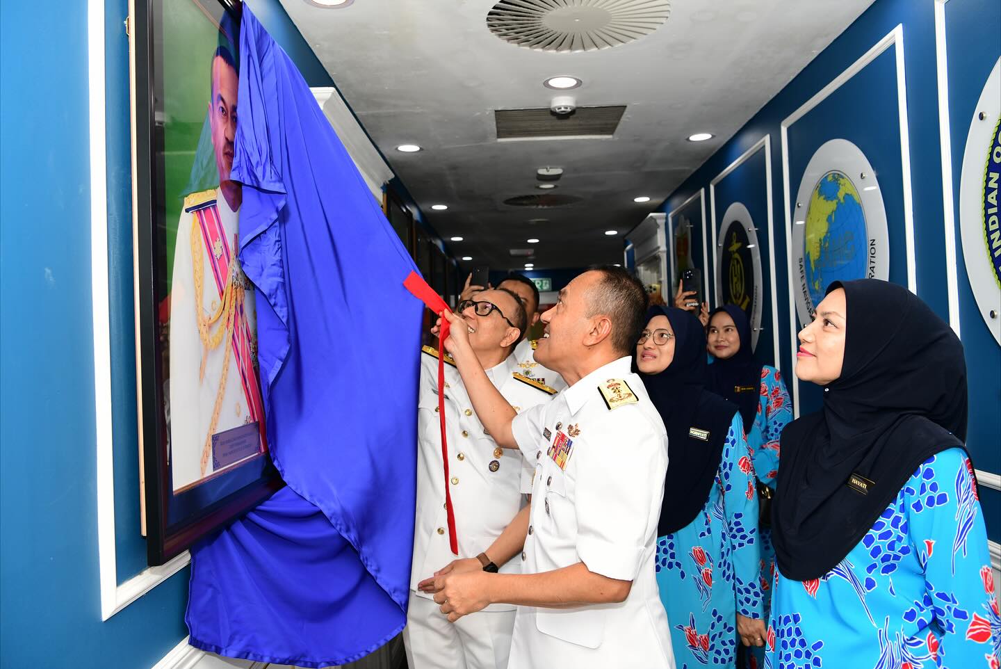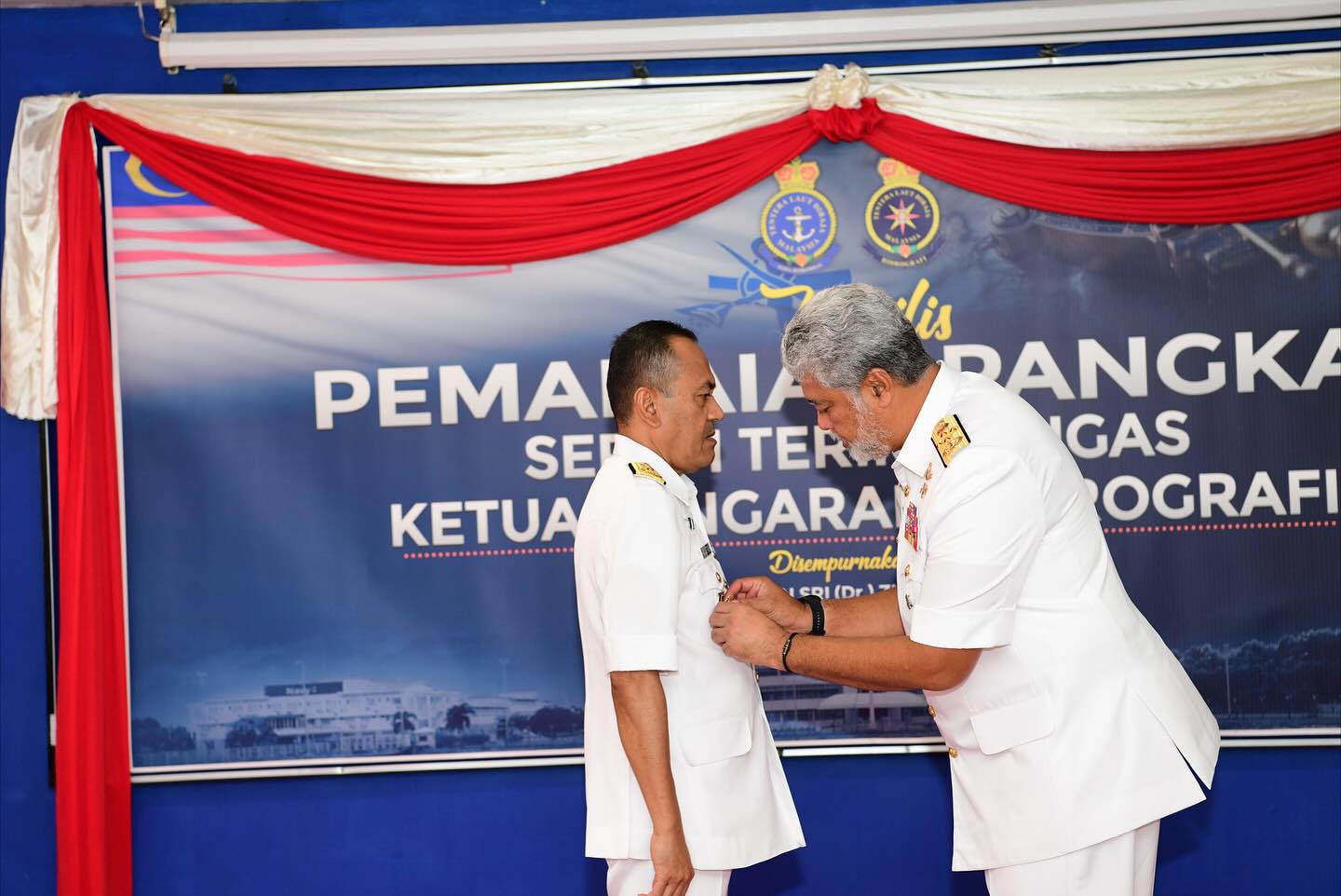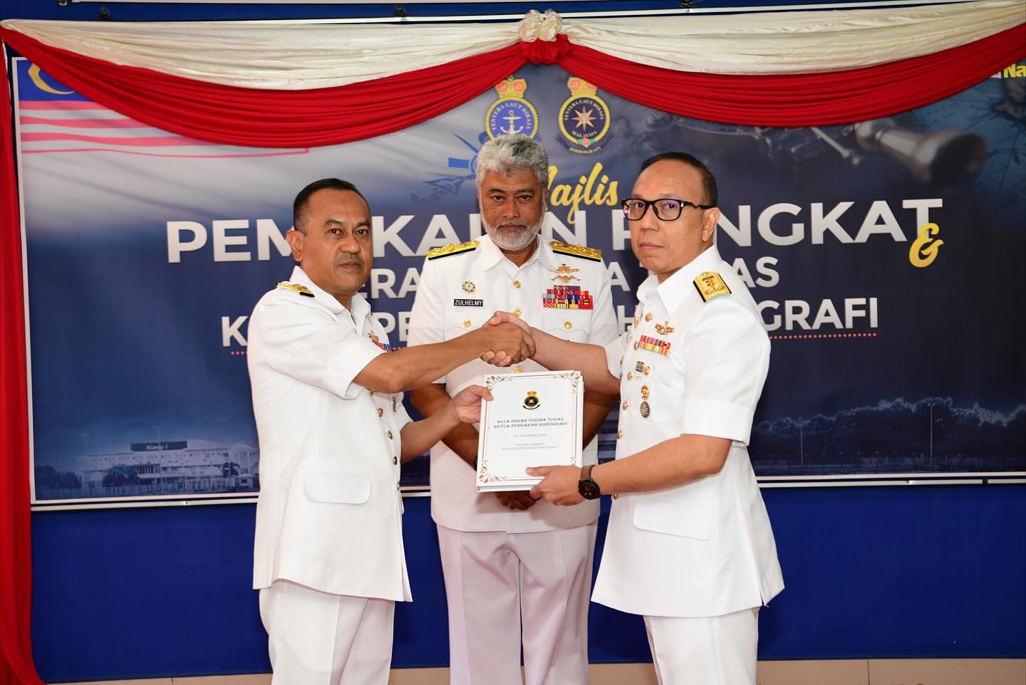 PULAU INDAH, 27 Okt 2025- MAJLIS PEMAKAIAN PANGKAT DAN SERAH TERIMA TUGAS KETUA PENGARAH HIDROGRAFI KE-8 telah berlangsung dengan penuh istiadat di Wisma Laskar, Pusat Hidrografi Nasional.Majlis disempurnakan oleh Panglima Tentera Laut, Laksamana Tan Sri (Dr.) Zulhelmy bin Ithnain, yang turut dihadiri oleh Ahli Jawatankuasa Laksamana (JLAKS) dan warga Pusat Hidrografi Nasional serta unit bawah naungan. Majlis dimulakan dengan Pemakaian Pangkat Timbalan Ketua Pengarah Hidrografi, yang telah dinaikkan pangkat ke Laksamana Muda berkuat kuasa pada 26 Oktober 2025. Majlis diteruskan dengan upacara menandatangani Sijil Serah Terima Tugas di antara Laksamana Muda Dato’ Hanafiah bin Hassan dan Laksamana Muda Dr. Najhan bin Md Said, diikuti dengan penyerahan Nota Serah Terima Tugas serta upacara menaik dan menurunkan Insignia Pemerintah. Majlis turut diserikan dengan upacara penyerahan simbolik pemerintahan serta laungan ‘Start Of Line’ yang menandakan penyerahan rasmi tampuk kepimpinan kepada Ketua Pengarah Hidrografi yang baharu.Di penghujung majlis, seluruh warga Pusat Hidrografi Nasional dan unit naungan berbaris dalam formasi ‘Street Lining’ sebagai tanda penghormatan terakhir kepada mantan Ketua Pengarah Hidrografi ke-7 yang berjalan melalui barisan warga sambil menerima lambaian dan salam perpisahan penuh hormat. Sekalung tahniah diucapkan kepada Laksamana Muda Dr. Najhan bin Md Said atas pelantikan sebagai Ketua Pengarah Hidrografi Ke-8, serta setinggi-tinggi penghargaan dan terima kasih kepada Laksamana Muda Dato’ Hanafiah bin Hassan atas kepimpinan, jasa dan sumbangan cemerlang sepanjang menerajui Pusat Hidrografi Nasional.