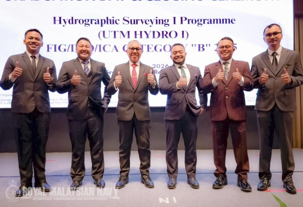 JOHOR, 13 JAN 2026- MAJLIS PENUTUP DAN GRADUASI KURSUS HYDROGRAPHIC SURVEYING PROGRAMME I ( UTM HYDRO I ) FIG/ IHO/ ICA CATEGORY B 2025 telah berlangsung dengan jayanya pada 9 Januari 2026 bertempat di Le Grandeur Palm Resort, Senai, Johor. Kursus ini telah dilaksanakan bermula 23 Jun 2025 hingga 9 Januari 2026 di Universiti Teknologi Malaysia (UTM), Skudai, hasil kerjasama strategik antara UTM dan Pusat Hidrografi Nasional (PHN). Program ini dirangka bagi melahirkan ahli hidrografi yang berkaliber dan kompeten, selaras dengan piawaian antarabangsa FIG/IHO/ICA, serta memenuhi keperluan keselamatan pelayaran dan pembangunan maritim negara. Majlis penutup dan graduasi kursus tersebut telah dirasmikan oleh Ketua Pengarah Hidrografi, YBhg Laksamana Muda Dr. Najhan Md Said. Dalam ucapannya, beliau menekankan bahawa program UTM HYDRO I merupakan platform penting dalam pembangunan modal insan hidrografi negara melalui gabungan pengisian teori dan praktikal yang disampaikan oleh tenaga pengajar serta pakar daripada UTM, PHN dan Universiti Malaysia Terengganu (UMT). Beliau turut merakamkan penghargaan atas komitmen berterusan semua pihak dalam memastikan program ini menepati standard dan pengiktirafan antarabangsa. Seramai 10 orang peserta daripada TLDM, Tentera Nasional Indonesia – Angkatan Laut (TNI-AL), Jabatan Laut Malaysia serta sektor industri maritim telah berjaya menamatkan kursus ini, sekali gus mencerminkan peranan UTM HYDRO I sebagai platform pembangunan profesional hidrografi di peringkat nasional dan antarabangsa. Anugerah kecemerlangan telah disampaikan kepada: